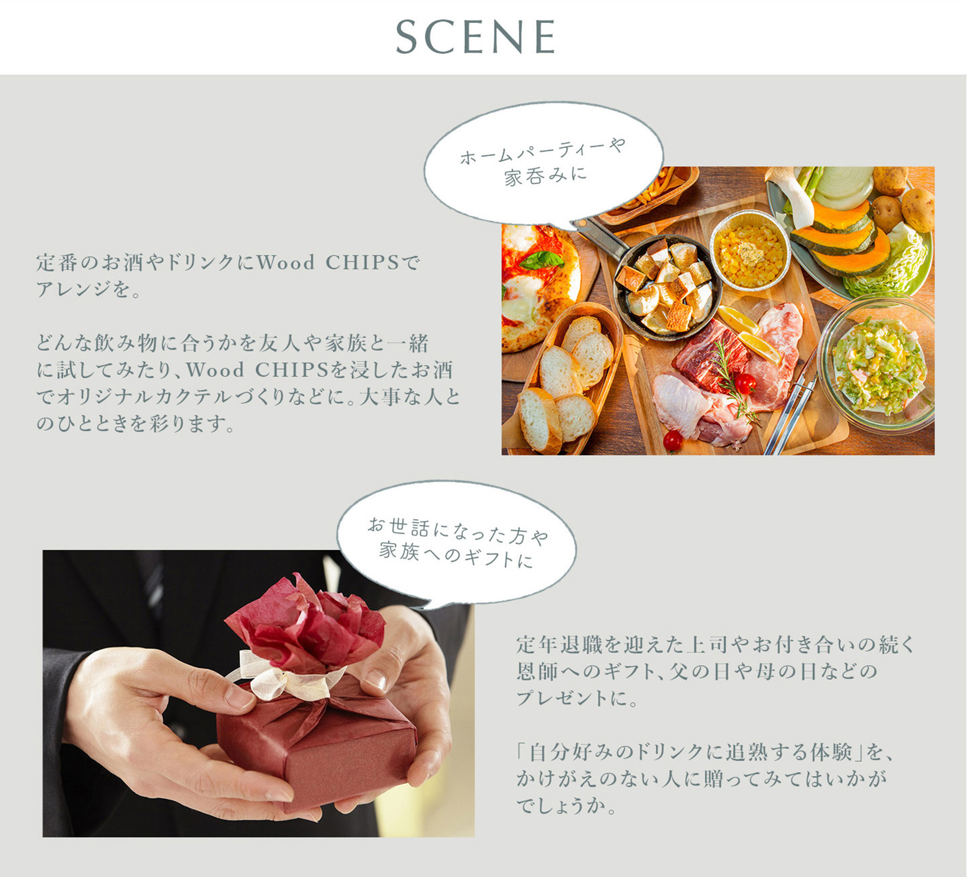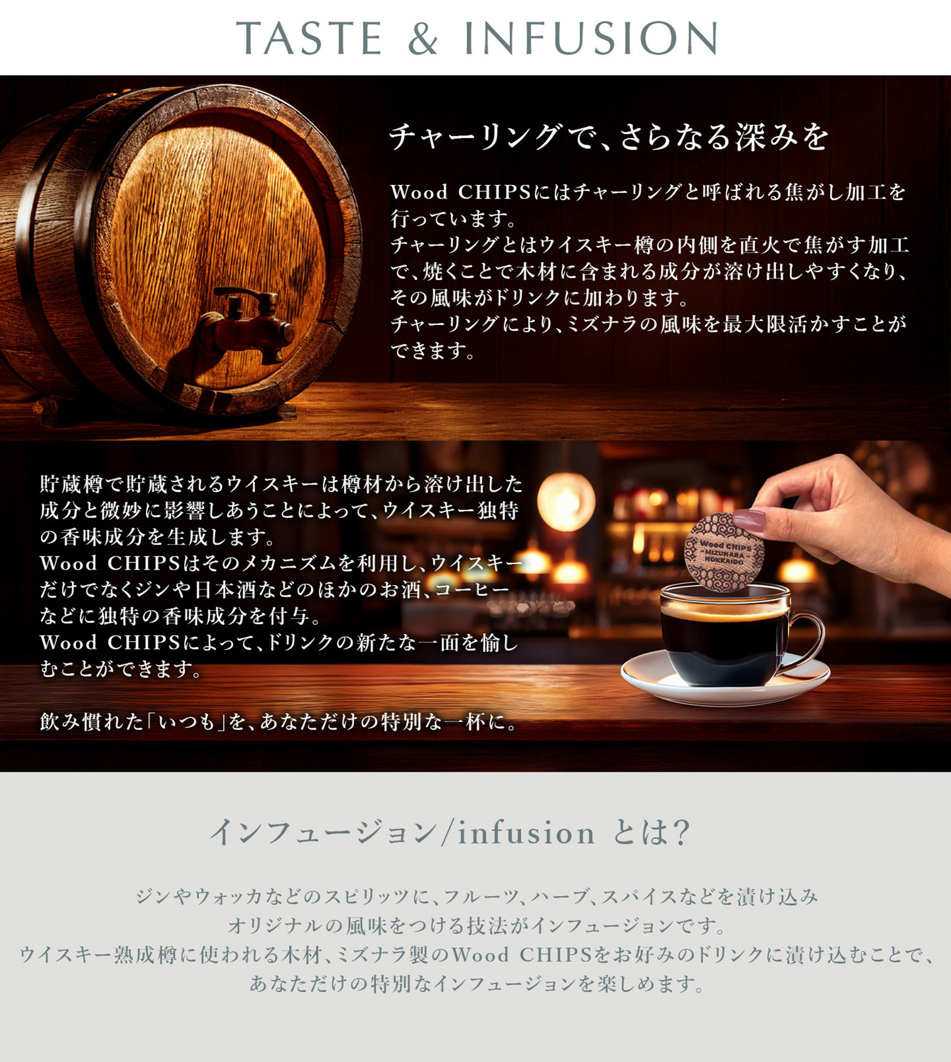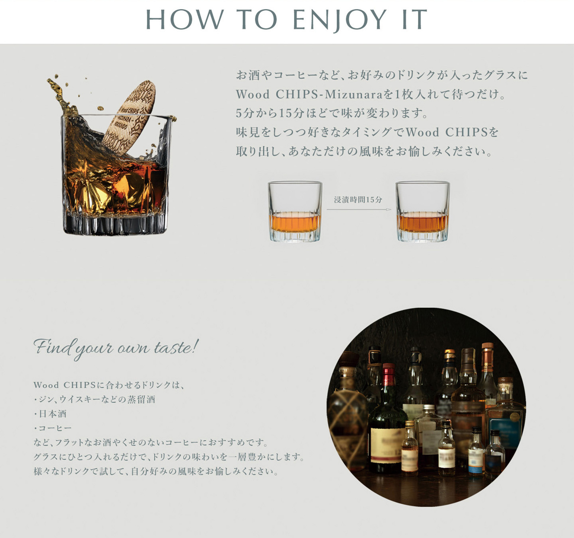 ウイスキーやカクテル、さらにはコーヒーや紅茶にも応用可能なWood CHIPS-Mizunara。お好みの飲み物に漬けるだけで、いつもとは一味違った風味を楽しむことができます。自宅やパーティーでの一工夫として、ぜひご活用ください。お友達やご家族とともに、新たな味わいの発見を楽しんでみてはいかがでしょうか!お楽しみいただける方が増えること間違いなしです。