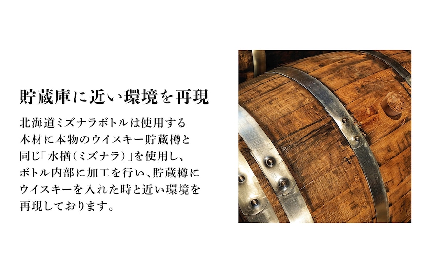 ミズナラボトルはそのミズナラ材を使用し、貯蔵樽に近い機能を再現しております。