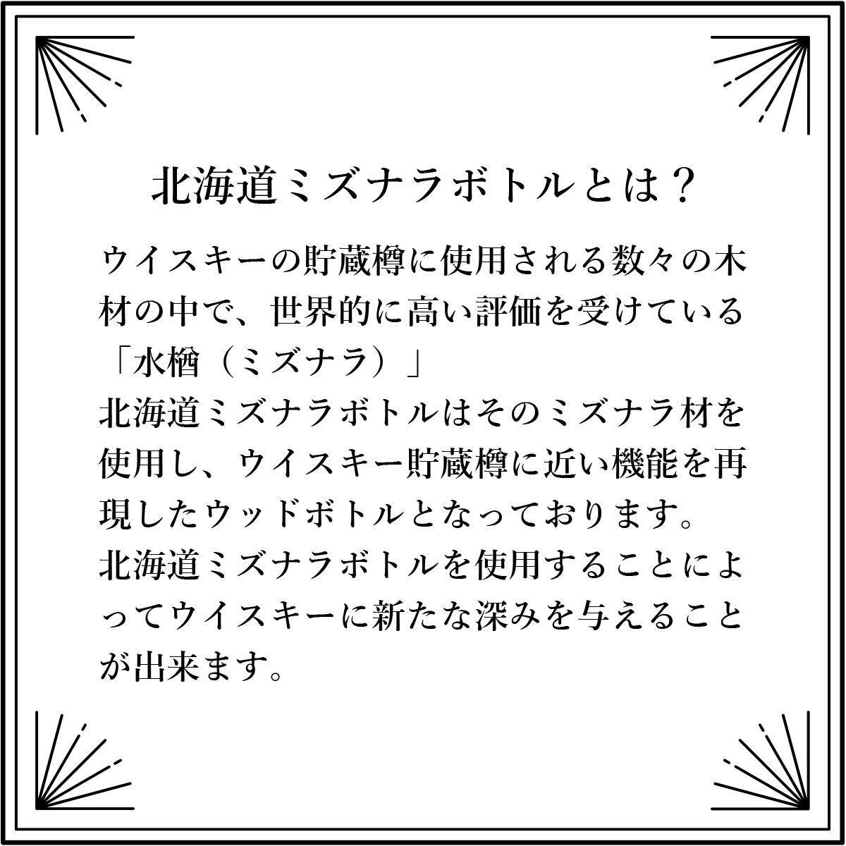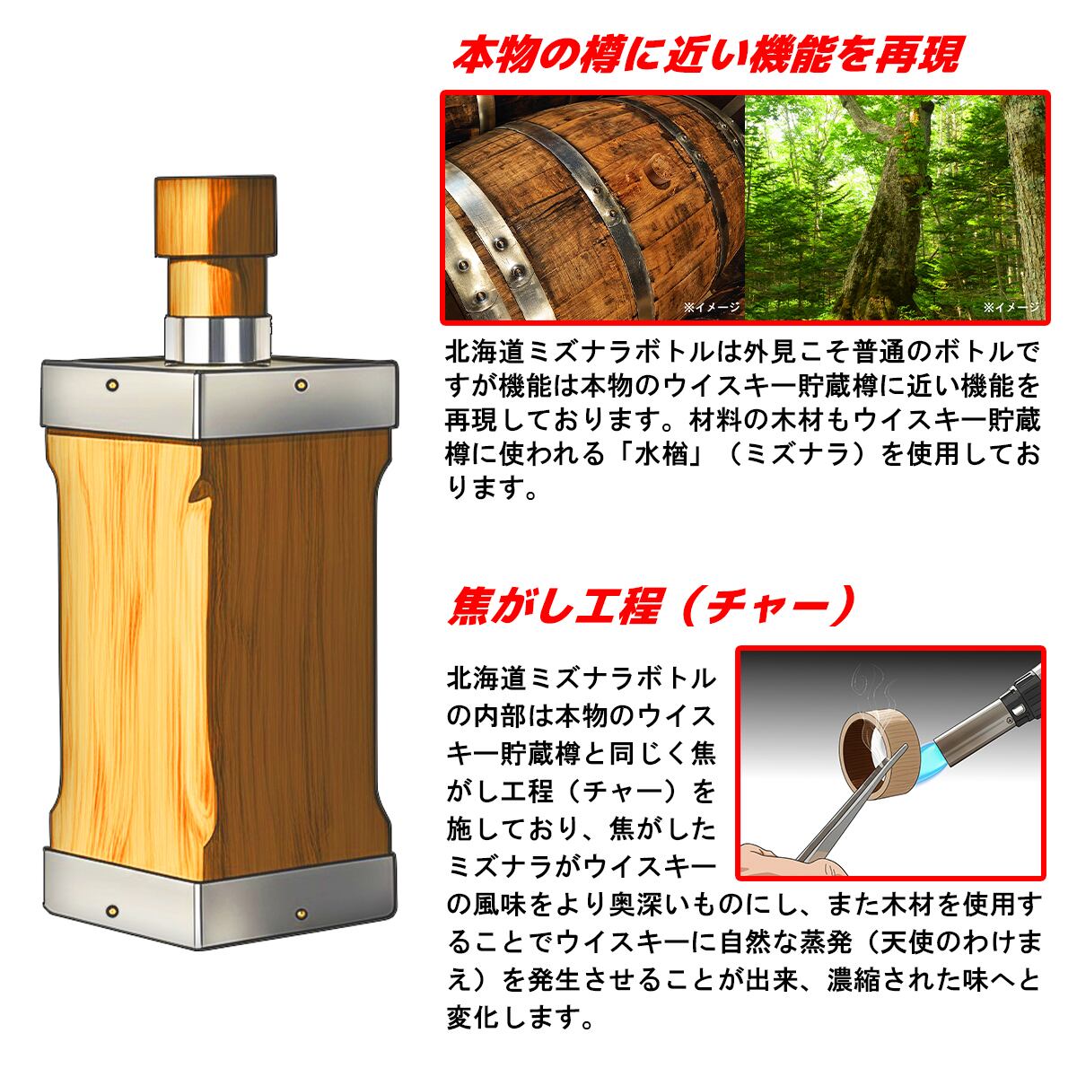 北海道ミズナラボトルは使用する木材に本物のウイスキー貯蔵樽と同じ「水楢(ミズナラ)」を使用しております。
