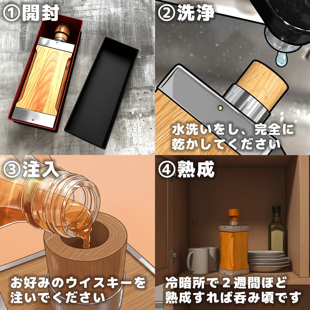 ご使用方法は北海道ミズナラボトルを水で洗浄し、完全に乾かし、ウイスキーをボトルの中に注いで冷暗所に2週間ほど保管しておくだけ。